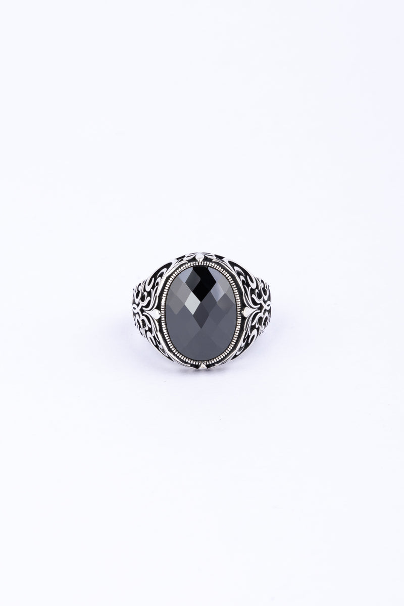 This exquisite ring showcases a striking, oval-shaped black onyx stone that has been expertly faceted to catch and reflect light. The gemstone is securely set in a high-quality sterling silver band that is adorned with intricate, vintage-inspired engravings. The ornate designs on the band give this piece a unique and sophisticated flair, perfect for those who appreciate detailed craftsmanship and timeless style.