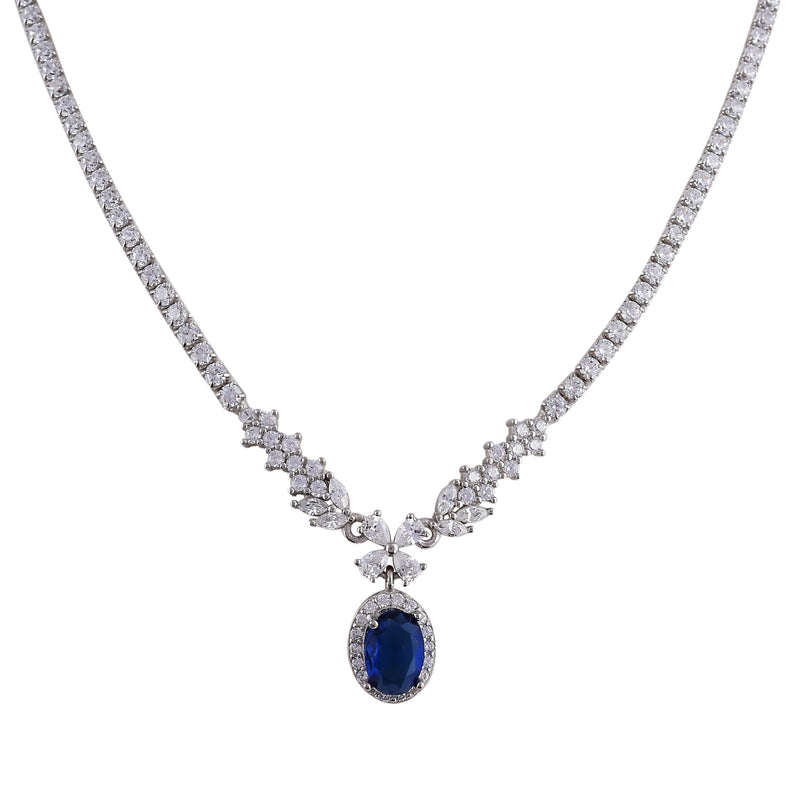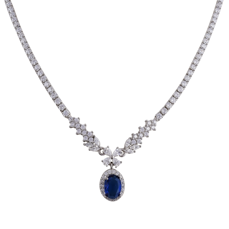 Elevate your ensemble with timeless grace in this Sapphire Elegance Drop Necklace. Crafted with dazzling round and marquise-cut stones along a refined tennis-style chain, this necklace culminates in a regal, deep blue oval gemstone centerpiece—evoking classic luxury and royal charm.