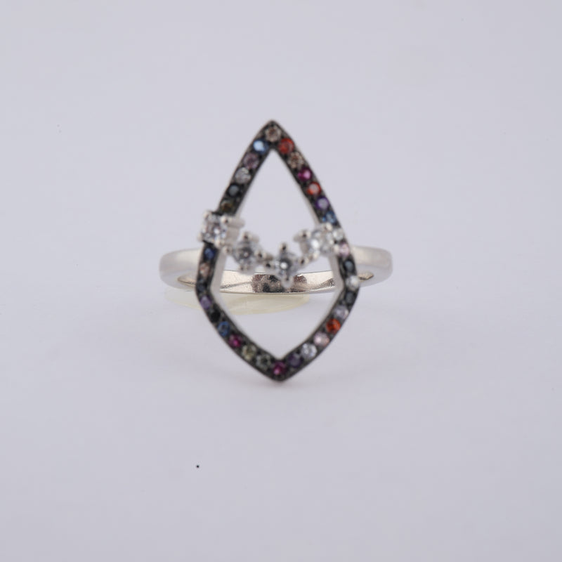 This stunning ring features an abstract design adorned with sparkling pave stones, crafted from high-quality silver. The combination of the innovative shape and shimmering accents creates a captivating and stylish look that stands out.