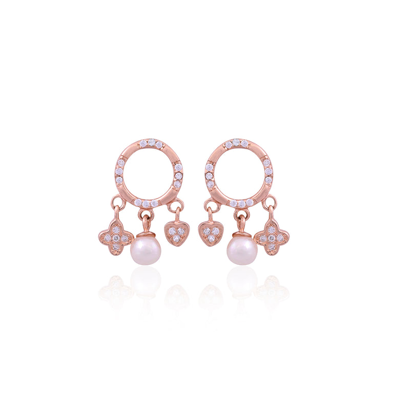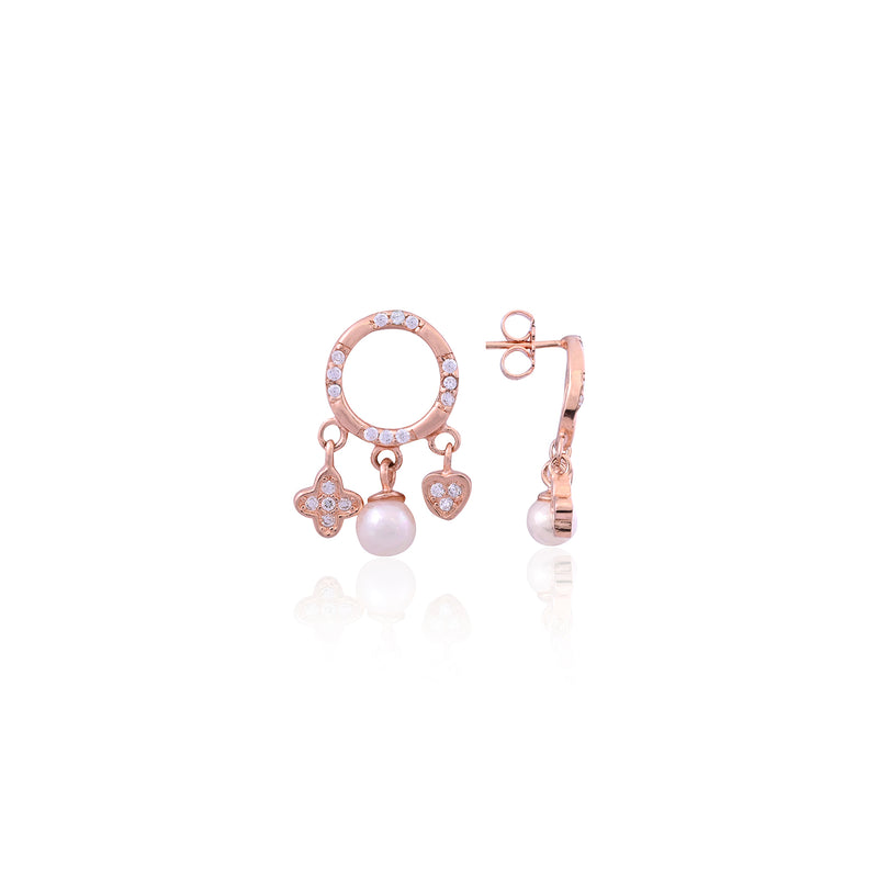 The Silver Rose Gold Charm Pearl Drop Earring is inspired by timeless elegance and delicate femininity. The graceful drop of the pearl paired with rose gold accents reflects purity, charm, and the quiet confidence of classic beauty.