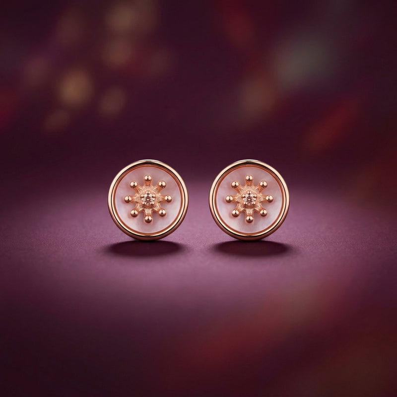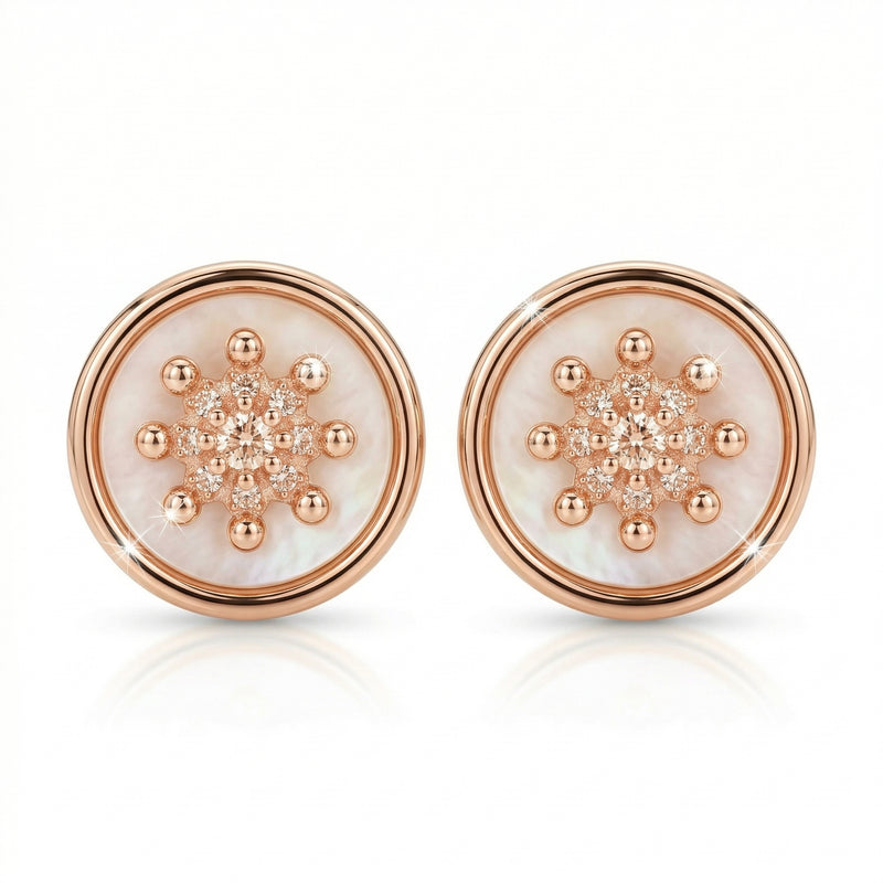 Add a touch of vintage grace to your jewelry collection with these 92.5 Fine Silver stud earrings, finished in a romantic rose gold plating. Each earring features a smooth Mother of Pearl disc, elegantly topped with a detailed rose gold floral centerpiece. Handcrafted and hallmarked for purity, these delicate studs offer a sophisticated, layered look that blends classic materials with modern design—ideal for both daily wear and special occasions.