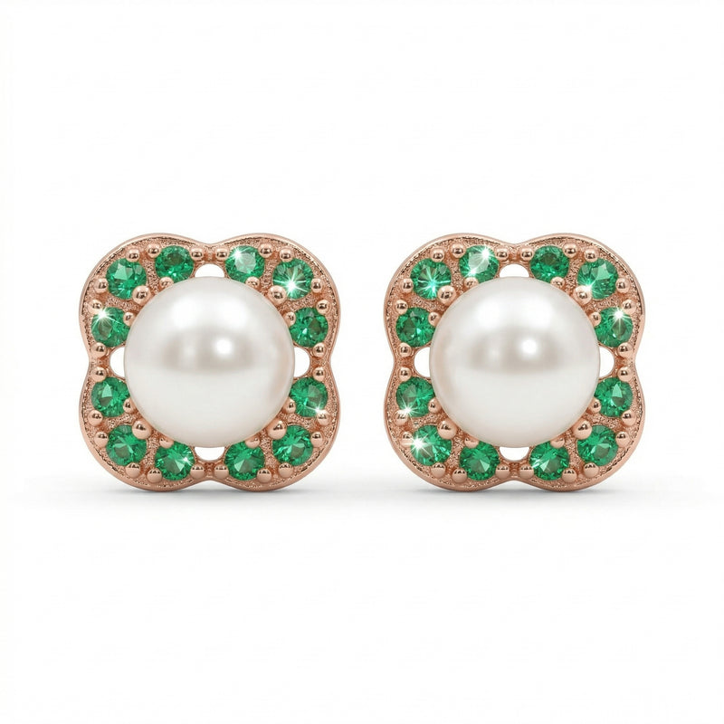 Bring a touch of regal charm to your look with these 92.5 Fine Silver stud earrings, finished in a warm rose gold plating. Each earring features a creamy white pearl at its center, beautifully framed by a soft-square halo of vibrant emerald-green zirconia. Handcrafted and hallmarked for purity, these elegant studs offer a timeless vintage-inspired aesthetic, perfect for those who appreciate classic color combinations and sophisticated craftsmanship.