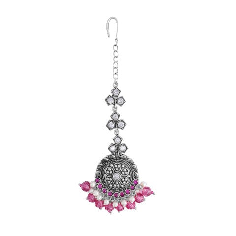 Antique Oxidized Silver Maang Tikka with Pink Beads & Mirror Accents