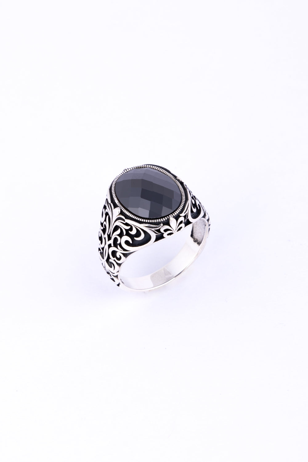 This exquisite ring showcases a striking, oval-shaped black onyx stone that has been expertly faceted to catch and reflect light. The gemstone is securely set in a high-quality sterling silver band that is adorned with intricate, vintage-inspired engravings. The ornate designs on the band give this piece a unique and sophisticated flair, perfect for those who appreciate detailed craftsmanship and timeless style.