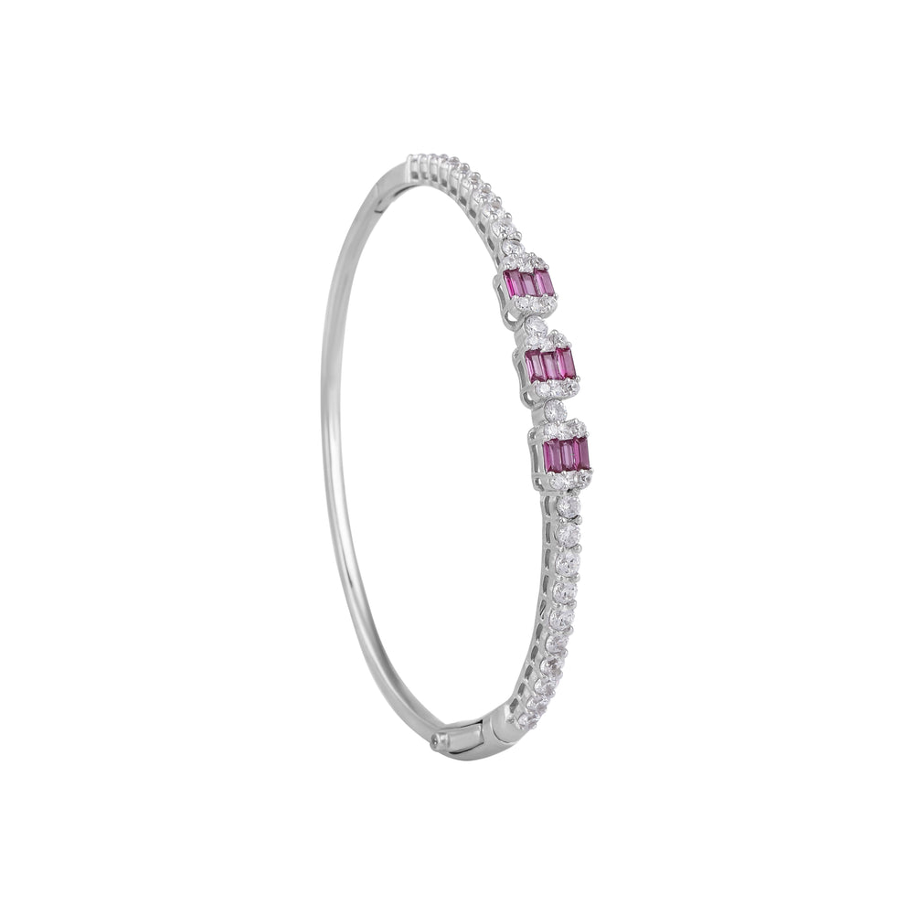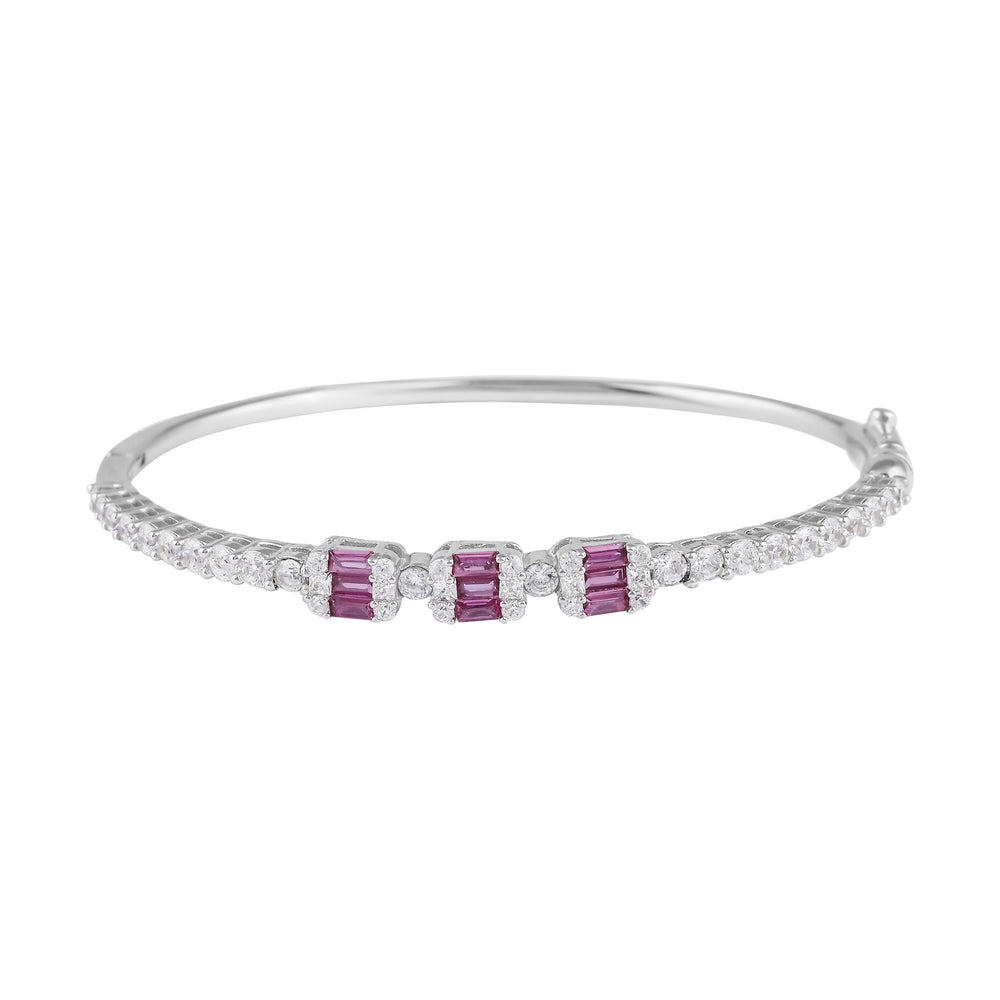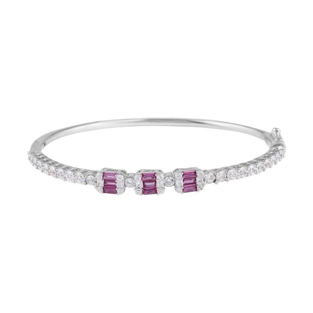 Add a touch of regal elegance to your jewelry collection with this Ruby Baguette & Diamond Halo Bangle. Featuring three vibrant clusters of ruby-hued baguette stones framed by brilliant-cut white stones, this bracelet makes a luxurious statement without being overpowering.