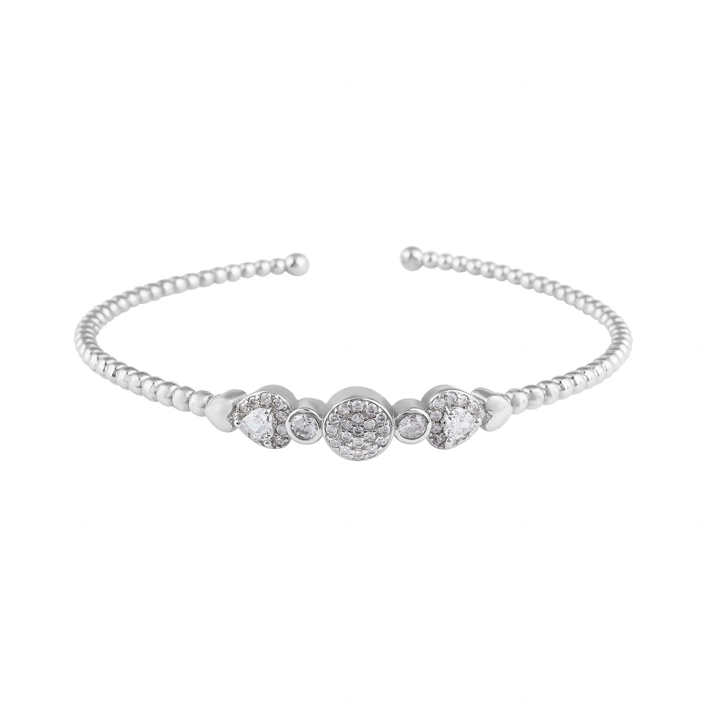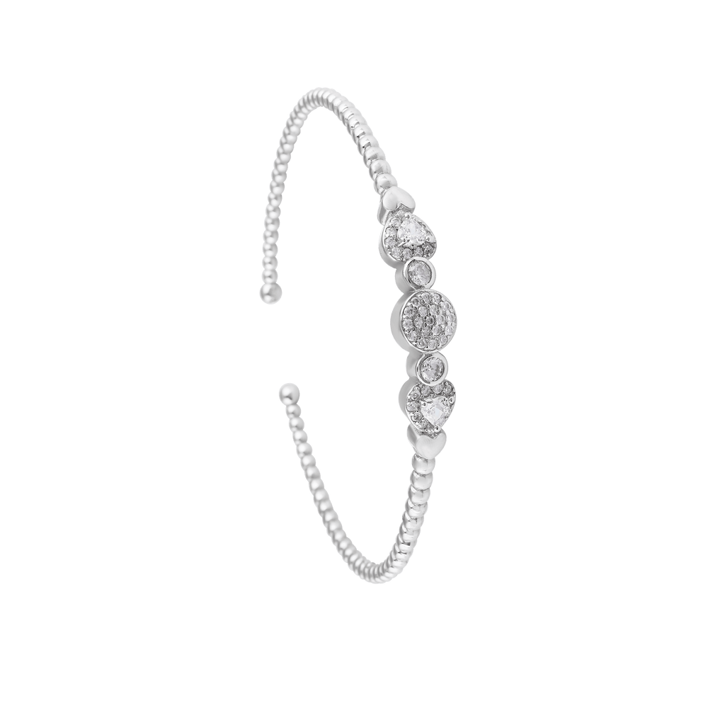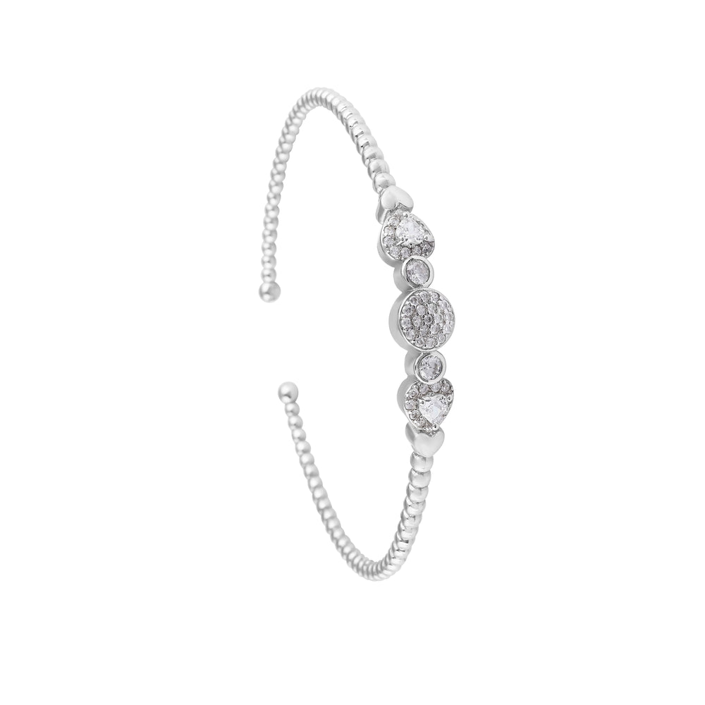 Grace your wrist with refined sparkle in this Crystal Cluster Open Cuff Bracelet. Designed with a delicate beaded silver band, this bracelet features a stunning arrangement of round and heart-shaped crystal accents that shimmer with every movement. The open-ended design ensures a comfortable and adjustable fit, making it an effortlessly chic addition to both everyday outfits and evening ensembles.