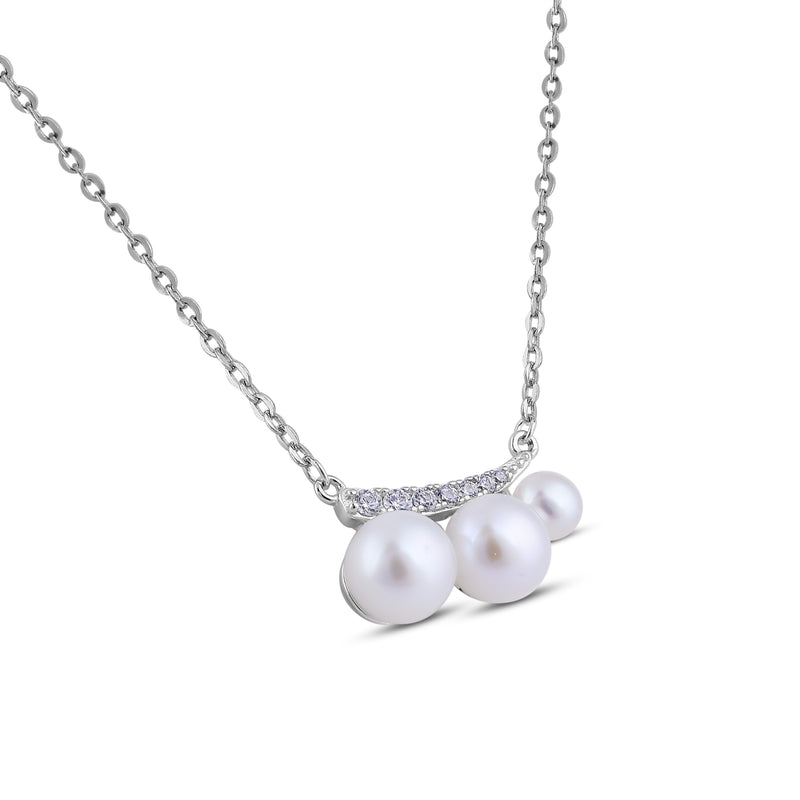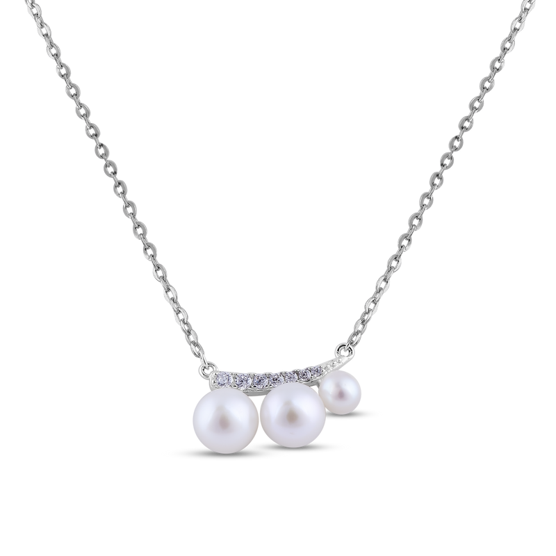 Add a touch of timeless elegance to your jewelry collection with this pearl pendant necklace featuring three luminous white freshwater pearls. Set on a delicate sterling silver chain, this necklace is adorned with a curved bar of sparkling cubic zirconia, creating a refined and luxurious look.