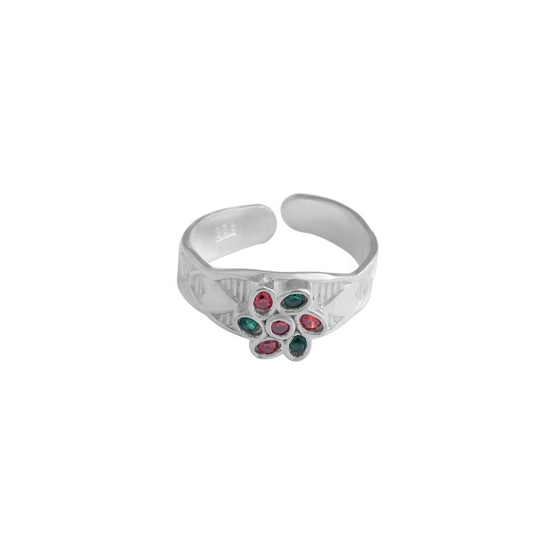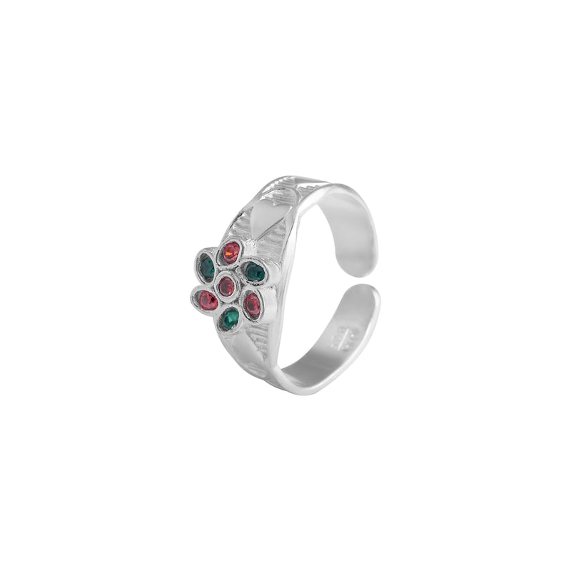 Step into elegance with this stunning 925 silver toe ring featuring a floral cluster of red and green gemstone accents. The design blends classic Indian artistry with contemporary wearability, making it perfect for everyday use or festive occasions.