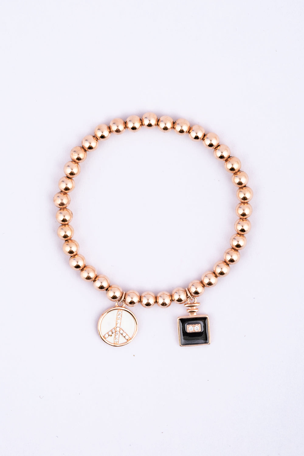 The bracelet is designed with a series of carefully strung gold-colored beads, creating a classic yet modern look. It includes two main charms: