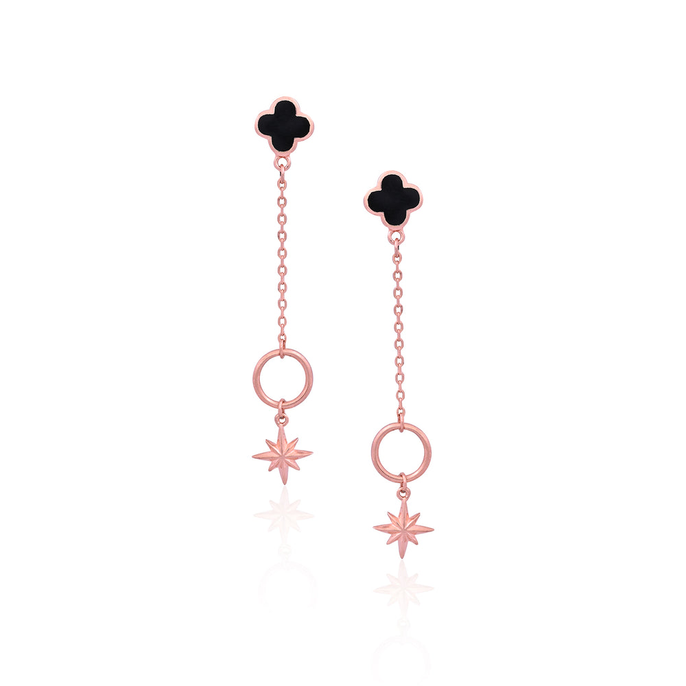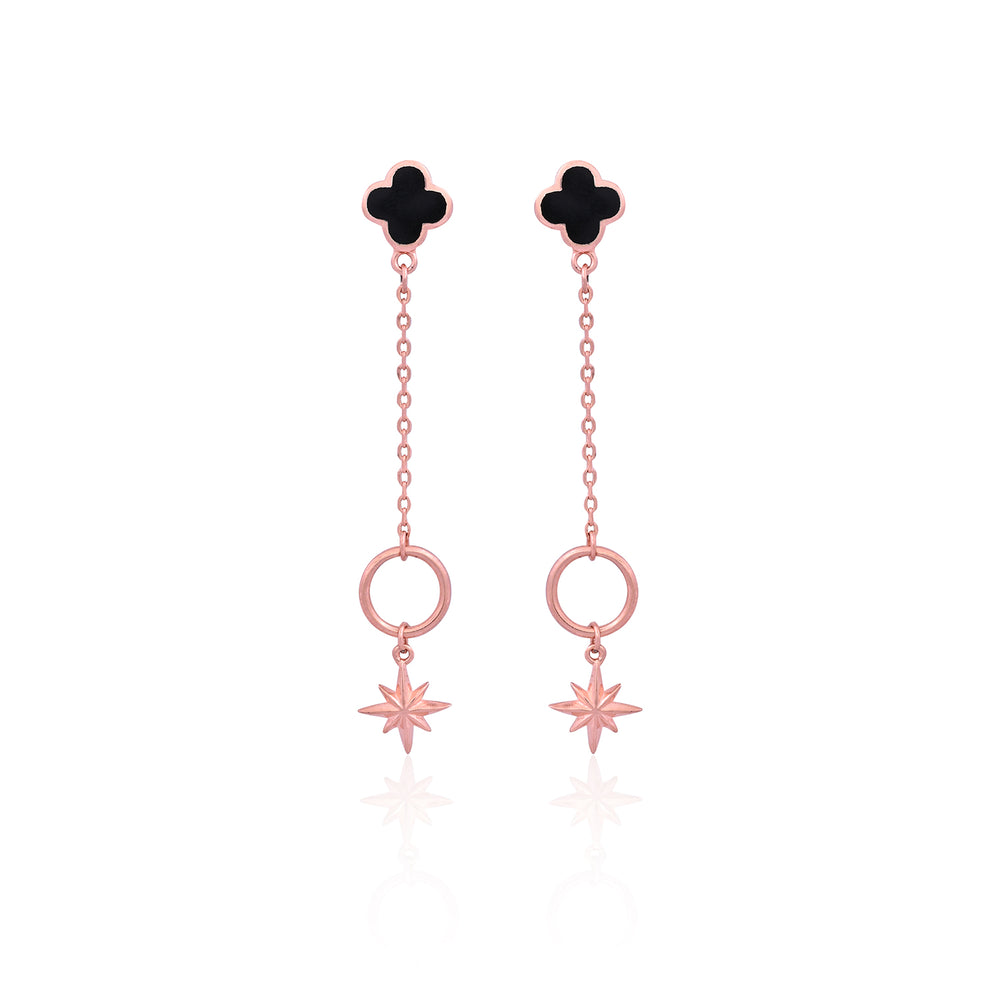Crafted in 925 sterling silver, these drop earrings feature a sleek silhouette adorned with a black clover charm and a delicate star. The elongated design adds fluid movement, making them a standout piece for both day and evening wear.