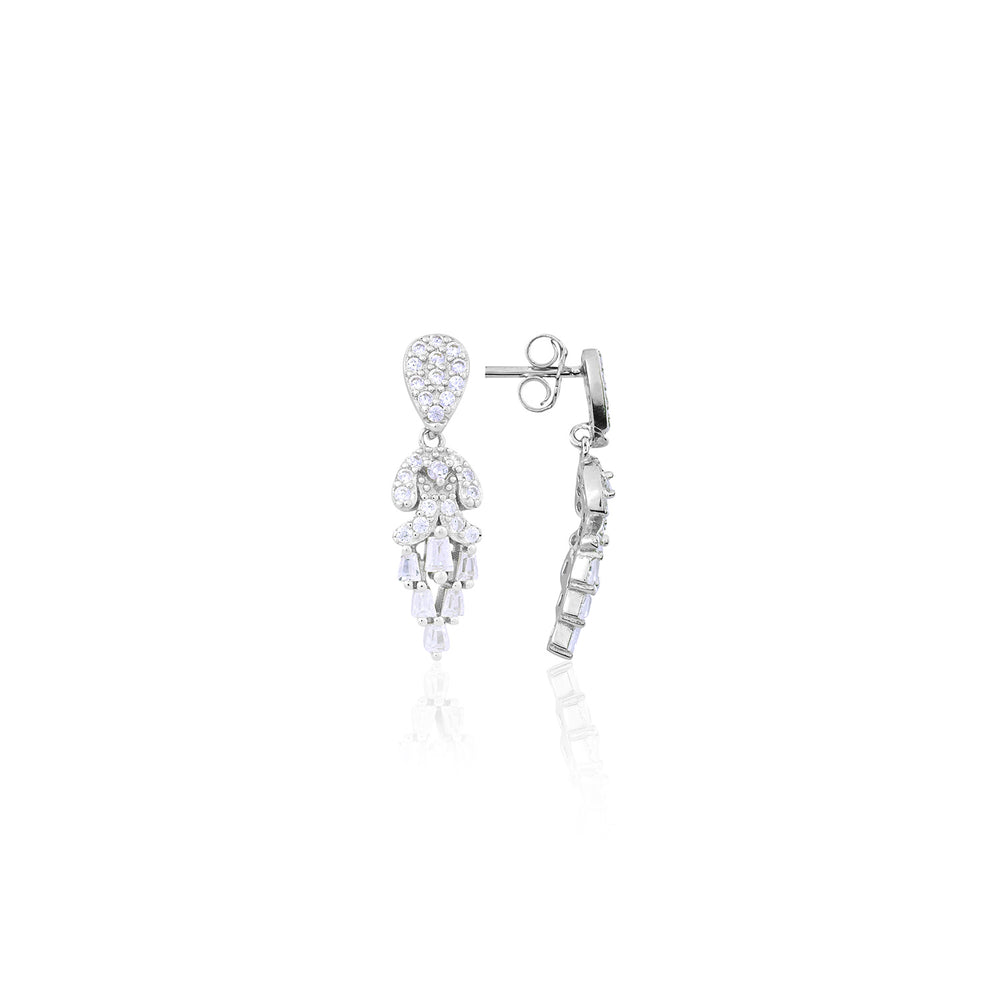 These sterling silver earrings feature a cascading arrangement of shimmering crystals, exuding sophistication and charm.