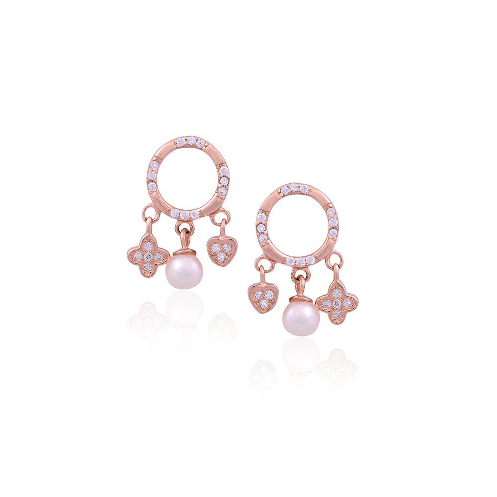 The Silver Rose Gold Charm Pearl Drop Earring is inspired by timeless elegance and delicate femininity. The graceful drop of the pearl paired with rose gold accents reflects purity, charm, and the quiet confidence of classic beauty.