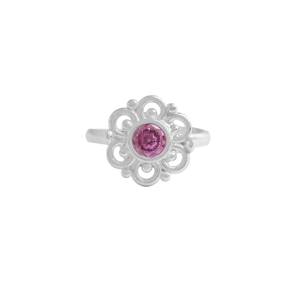 Vintage Floral Sterling Silver Ring with Pink Stone