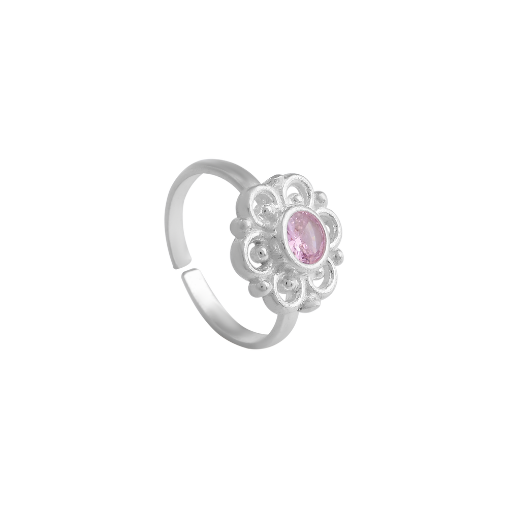 Delicate, charming, and timeless — this floral-inspired sterling silver ring features a beautifully faceted pink stone at its center, encased in an intricate, vintage-style petal design. The adjustable band ensures a comfortable fit for all fingers, making it a versatile addition to your jewelry collection.
